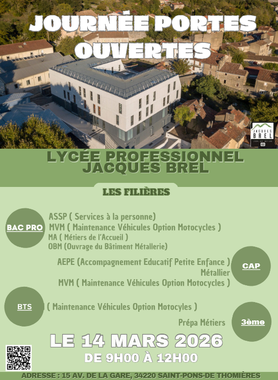 • Journées Portes Ouvertes au Lycée Jacques Brel de St Pons de Thomières le 14 mars 2026 de 9h00 à 12h00 :